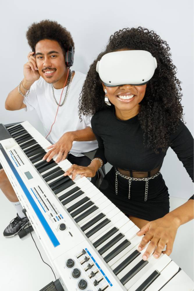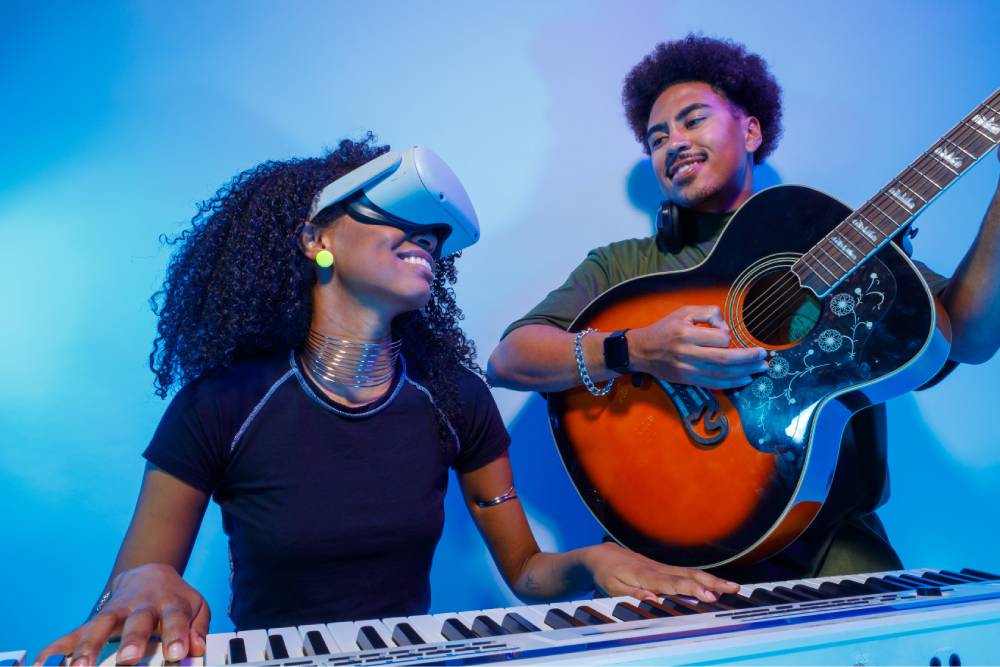 A realidade mista integra elementos virtuais ao ambiente real, permitindo uma experiência interativa onde o usuário aprende música de forma visual, prática e imersiva.